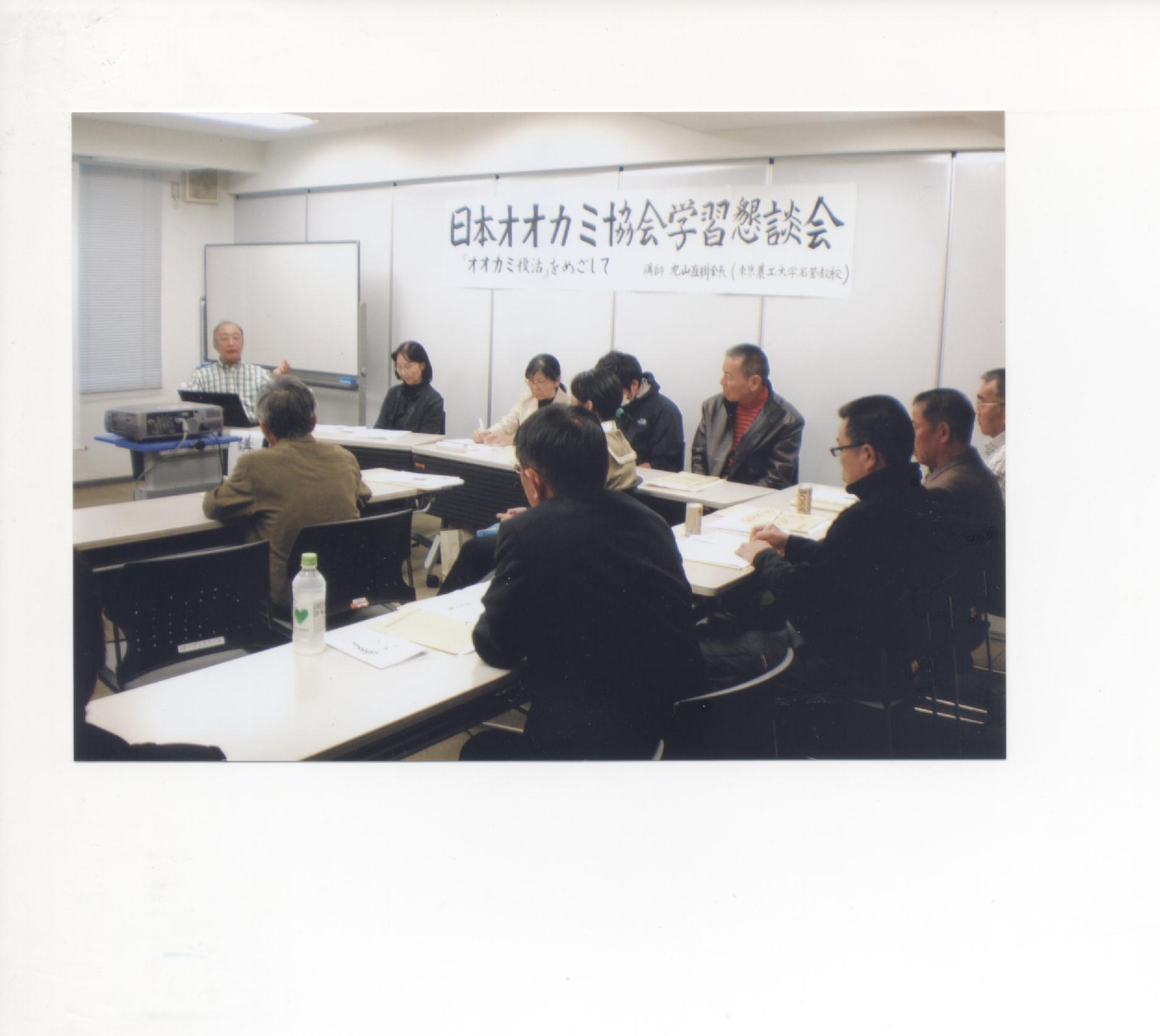 「オオカミ復活をめざして」と題し初めての学習会には当初の心配をよそに多くの参加を得て大成功のうちに終わることが出来ました。会員6名、一般17名そして会長の丸山夫妻と合計25名が集い、3時間の時間はまたたく間に過ぎました。岡山県においても鳥獣害は大きく、年約4億円以上の被害額になっています。「焼石に水」的な施策以外になにか方法はないかとの思いで出席された行政にかかわる議員ならびに役所の方も出席され、小さな穴ながらも突破口が見えて来ました。
